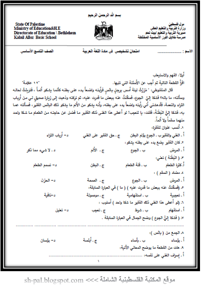 امتحان تشخيصي في اللغة العربية للصف التاسع المكتبة الفلسطينية الشاملة