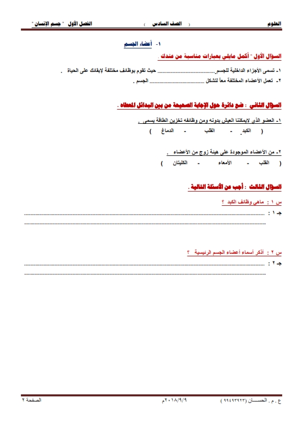 اسئلة واجوبة جسم الانسان في العلوم للصف السادس الفصل الاول