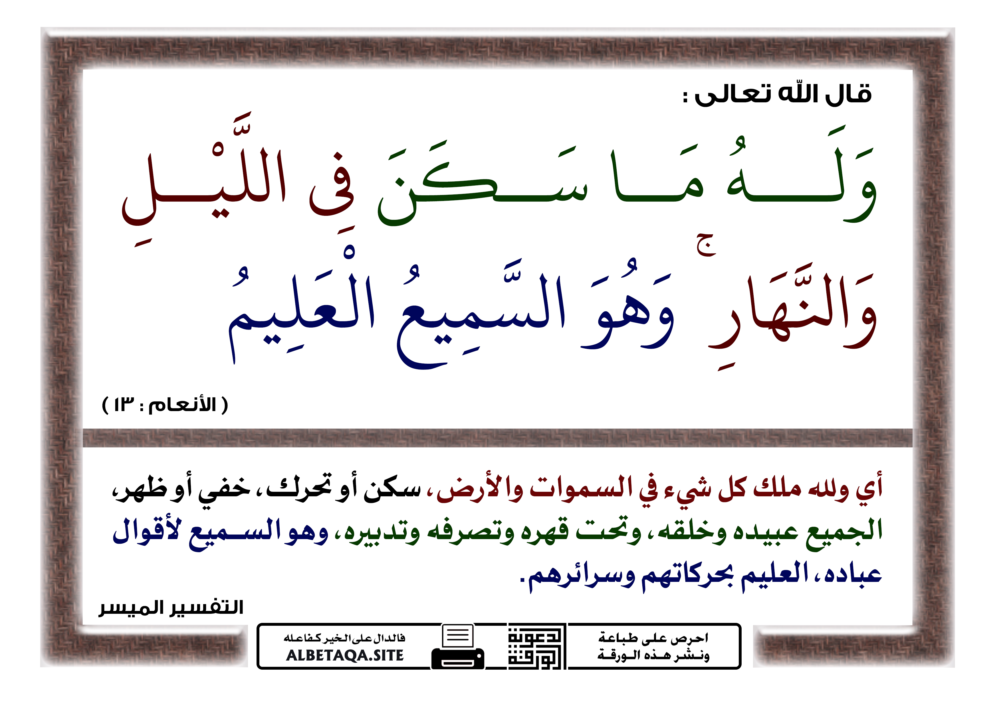 و ل ه م ا س ك ن ف ي الل ي ل و الن ه ار و ه و الس م يع ال ع ل يم تفسير القرطبي الأنعام 13
