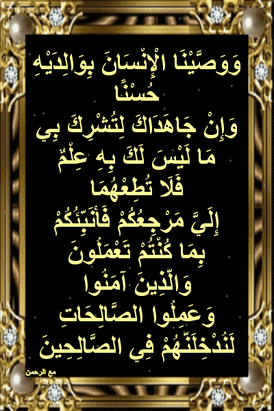 القران الكريم و و ص ي ن ا ال إ ن س ان ب و ال د ي ه ح س ن ا و إ ن ج اه د اك ل ت ش ر ك ب ي م ا ل ي س ل ك ب ه ع ل م ف ل ا ت ط ع ه م ا إ ل ي م ر ج ع ك م ف أ ن ب ئ ك م ب م ا ك ن ت م ت ع م ل ون