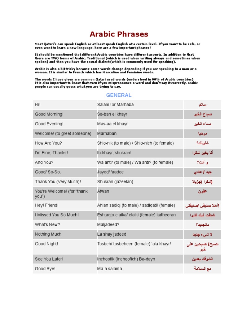 Qatari Arabic Phrases Arabic Lexicology